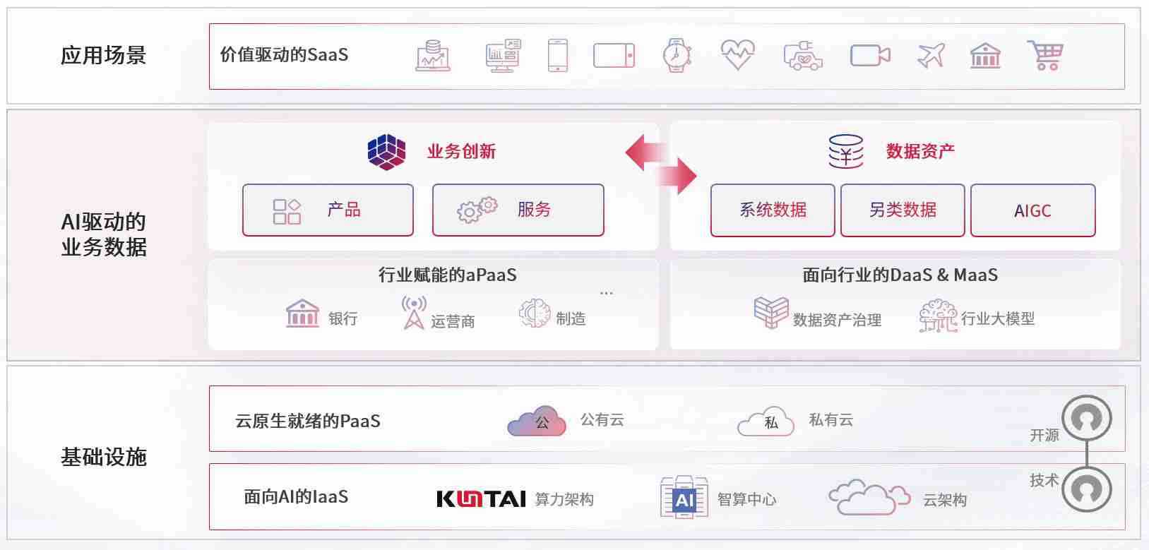 数字时代,,,,围绕企业数字化转型的关键要素,,,,k8.com数码开创性的提出数云融合战略和技术体系框架,,,着力在云原生、、数字原生、、、、AI原生和信创产业上架构产品和服务能力,,,为处在不同数字化转型阶段的快消零售、、汽车、、、金融、、医疗、、、政企、、、教育、、、运营商等行业客户提供泛在的敏捷IT能力和融合的数据驱动能力,,构建跨界融合创新的数字业务场景和新业务模式,,,助力企业级客户建立面向未来的核心能力和竞争优势,,,全面推动社会的数字化、、、智能化转型升级。。。