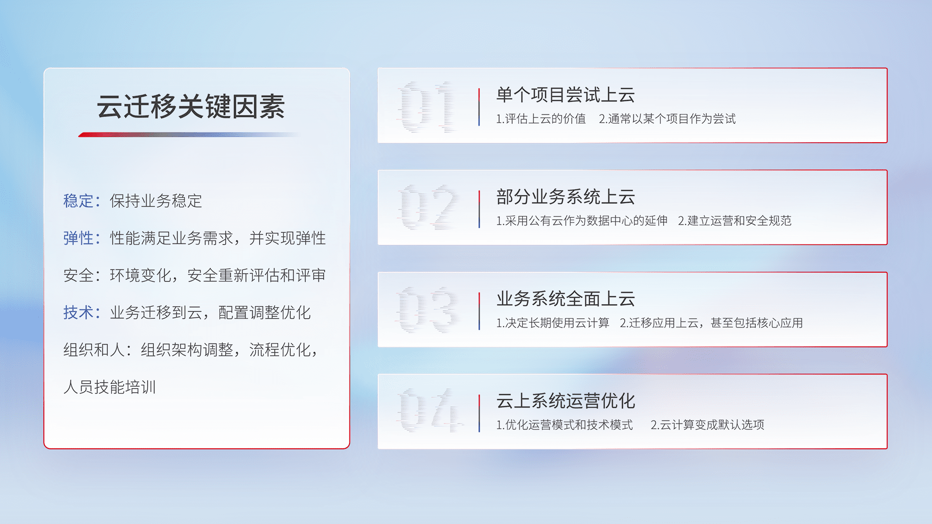 结合实际业务,,,,从规划设计、、云平台选型、、、云原生改造、、、数据迁移、、、集成交付,,,,迁移全过程为客户识别最佳上云路径,,做好风险识别管理,,,设计网络架构、、、身份权限、、安全审计合规、、、操作审计、、、、日志审计、、监控告警策略、、、、多站点容灾设计等,,,,对云上基础设施进行整体规划,,提升IT治理水平,,,以满足弹性、、高可用、、高性能的需求。。。