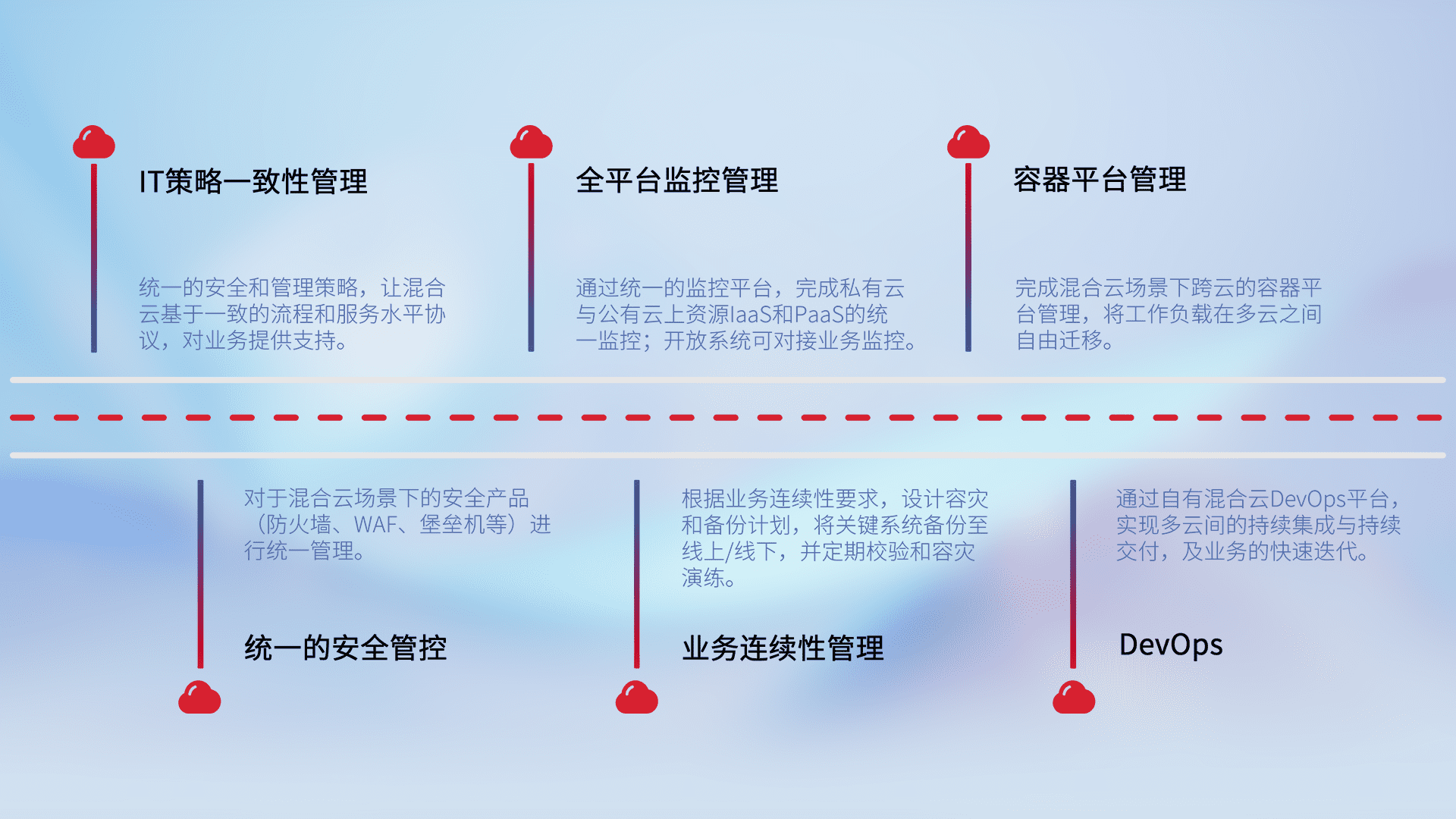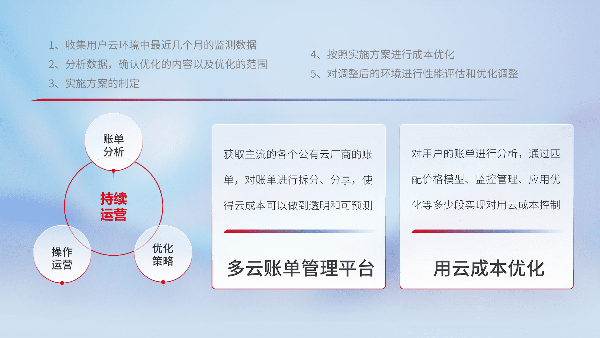 通过多云纳管,,,,以统一的资源数据模型把客户的云资源进行抽象和封装,,进而实现对多云资源的统一操作,,,,保障云资源管理的可靠性、、稳定性与可用性。。量身定制化运维内容,,配置、、、开发运维、、、、补丁管理、、、备份、、、、监控、、、、认证和访问管理、、审计和日常巡检等,,,保障在用云过程中的可靠度,,稳定度以及高可用率。。。